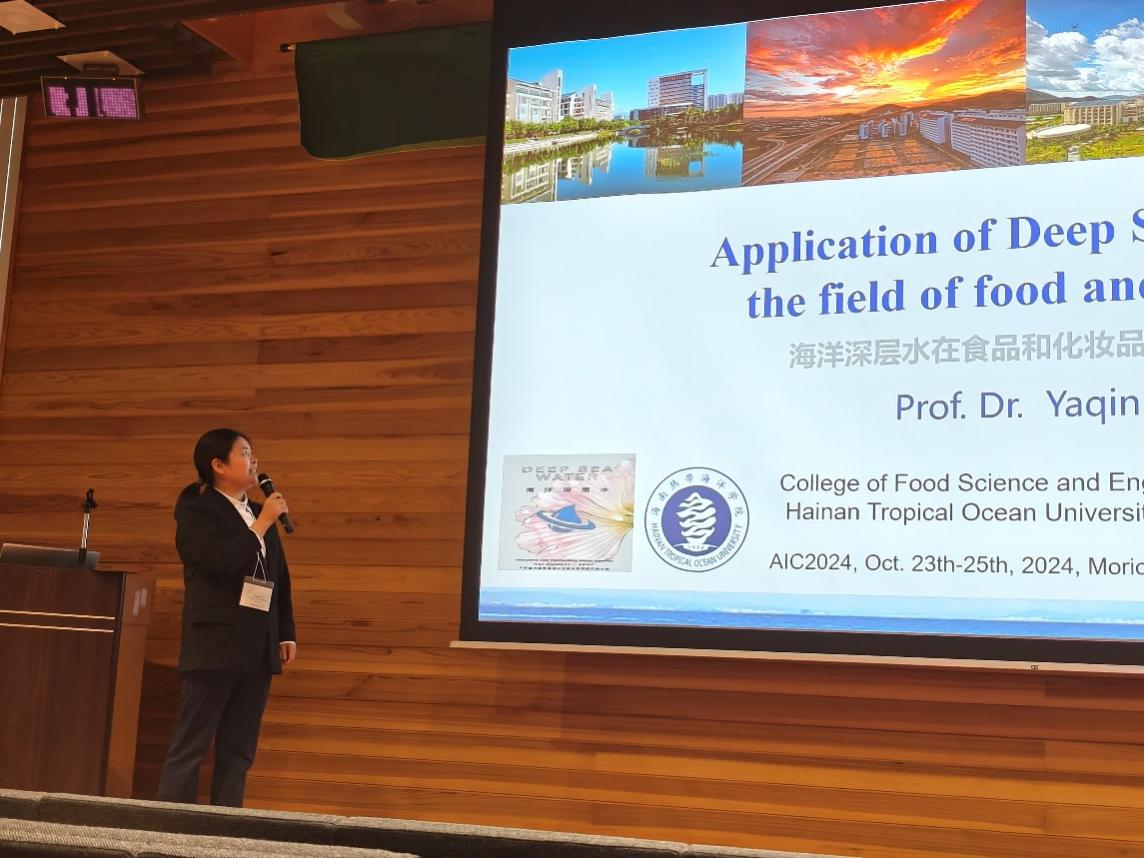 此次会议中,胡亚芹教授作为受邀专家,在大会上作了题为“Application of deep sea water in the field of food and cosmetic”的主题报告,着重介绍了南海特有的海洋深层水资源在食品、化妆品中的广泛应用。