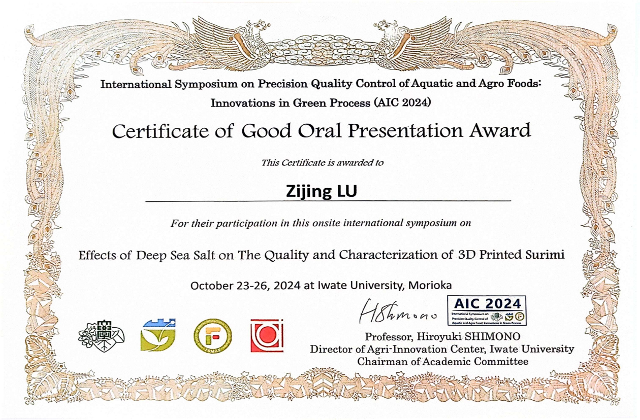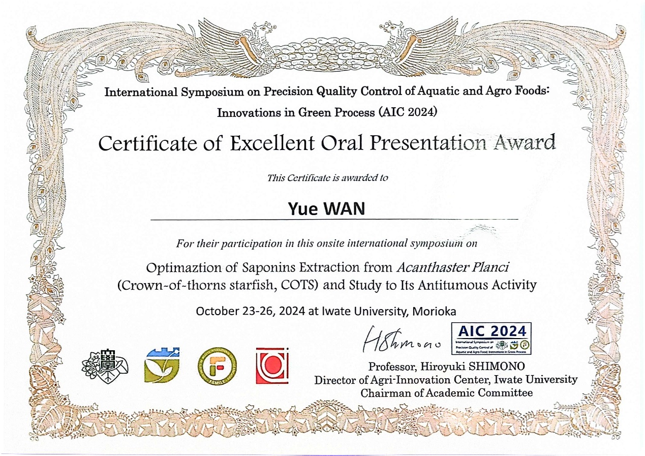 10月23日至26日,公司胡亚芹教授带领生物与医药硕士研究生吴亦朵、万越、卢紫腈三人赴日参加“International Symposium on Precision Quality Control of Aquatic and Agro Foods: Innovations in Green Process (AIC2024)”,此次会议由农业创新中心(AIC)主办、日本岩手大学承办,共有中、日、韩、美、欧等10个国家,120余名研究者参会,主要介绍和讨论了食品系统质量控制和可持续性发展的最新科学进步和技术成果。