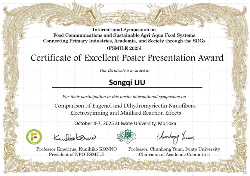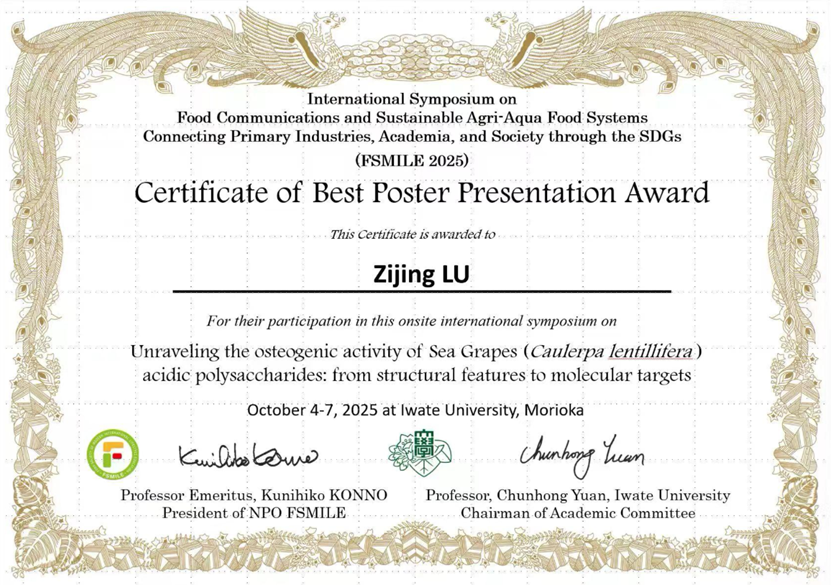 此外,公司研究生在胡亚芹教授的指导下积极参与会议学术交流,表现突出。刘松奇、刘广聿、卢紫腈、吴亦朵、燕嘉五位同学以线上形式进行了墙报展示,内容涵盖纳米纤维制备、复合膜保鲜技术、海藻多糖成骨活性、微生物发酵剂对水产品品质影响及新型冷冻技术在食品方面的应用等多个前沿方向。其中,刘松奇同学的墙报荣获“最佳墙报奖”,卢紫腈同学荣获“优秀墙报奖”,体现了公司研究生扎实的科研素养与国际化学术交流能力。