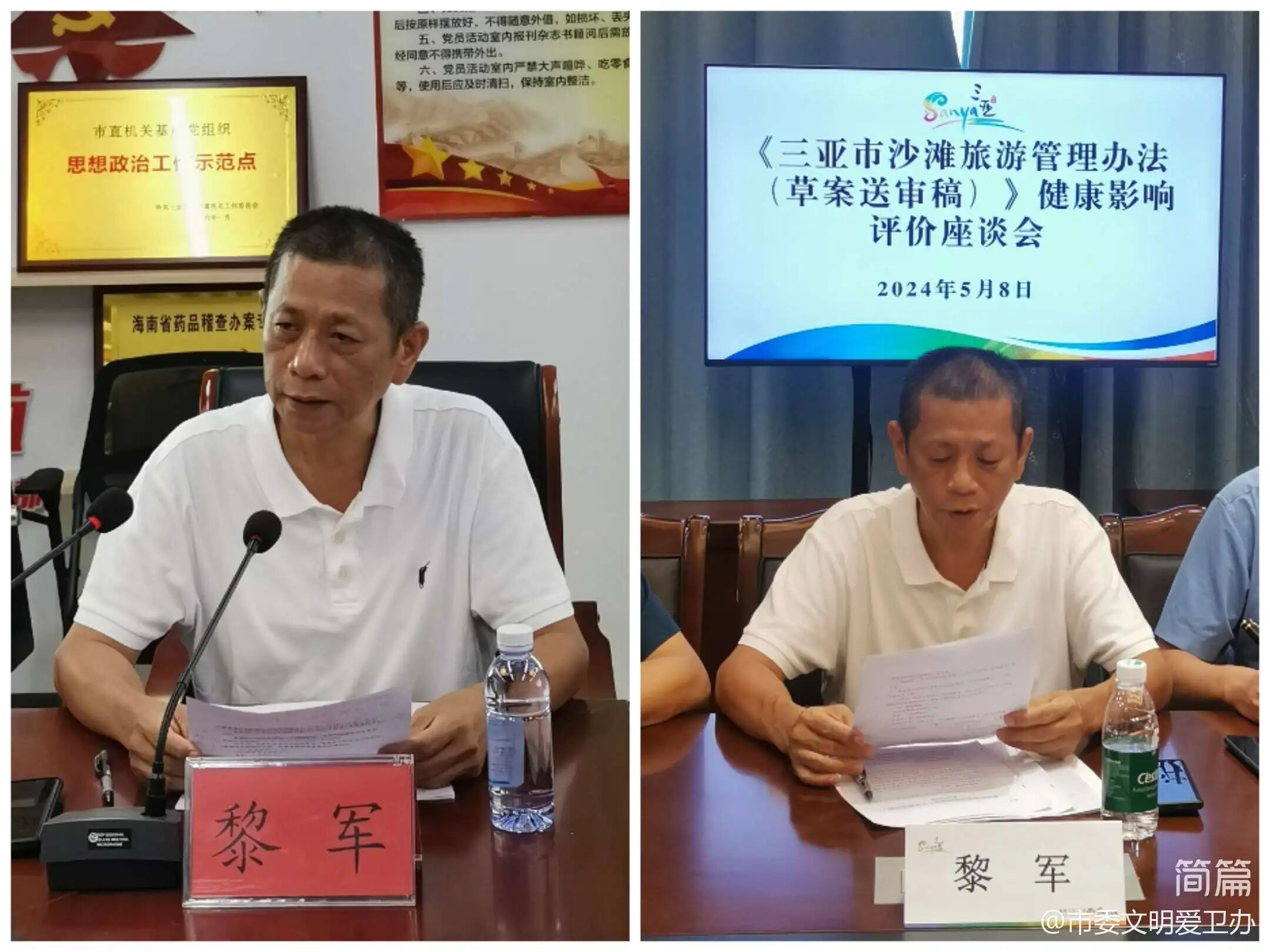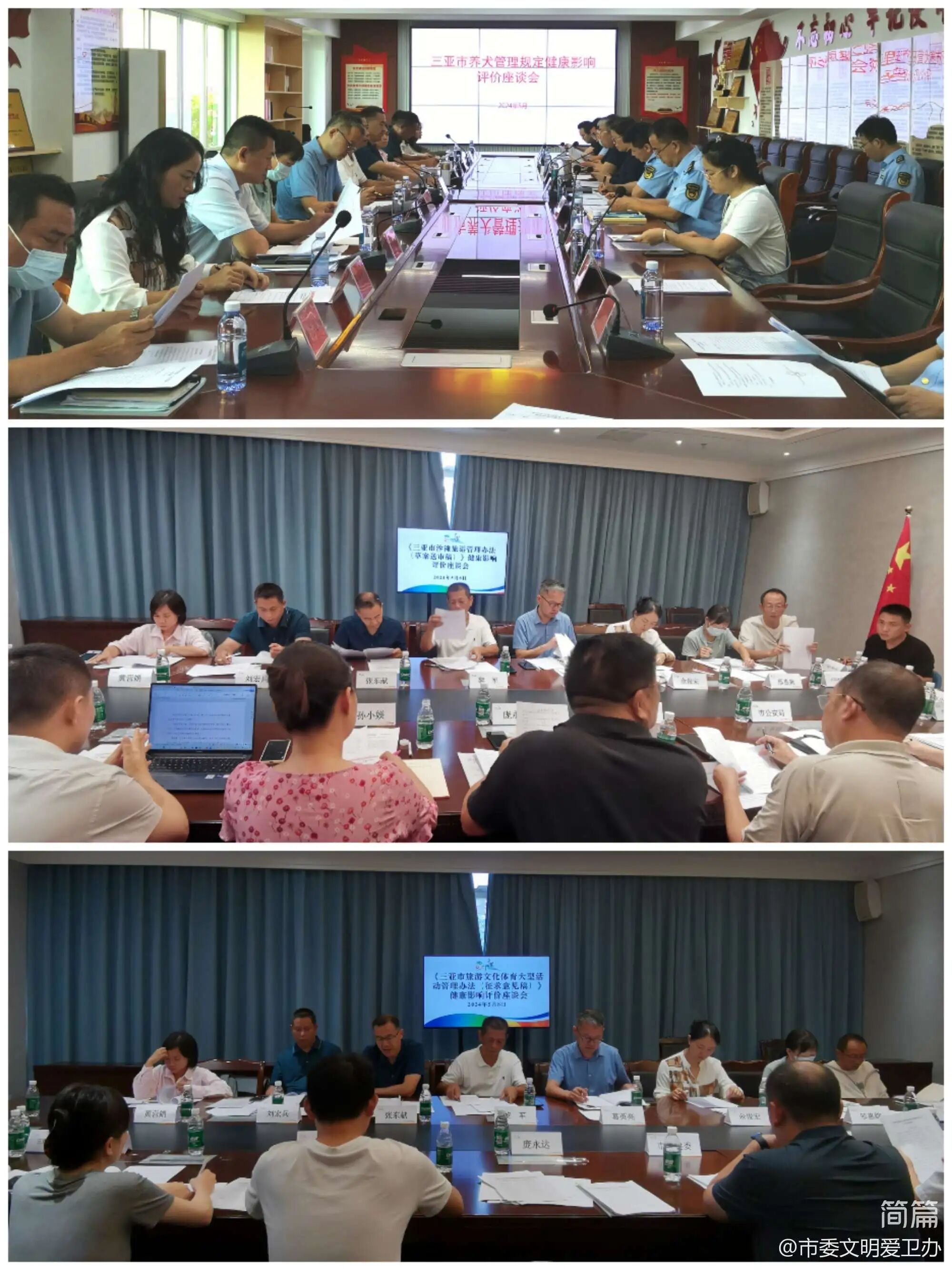5月8日上午,市委精神文明爱卫办在市综合行政执法局会议室组织召开了《三亚市养犬管理规定(征求意见稿)》公共政策健康影响评价座谈会;5月8日下午,在市旅文局会议室组织召开了《三亚市沙滩旅游管理办法(草案送审稿)》及《三亚市旅游文化体育大型活动管理办法(征求意见稿)》公共政策健康影响评价座谈会。专家组以及市公安局、市住建局、市自规局、市应急管理局、市农业农村局、市卫生健康委员会、市营商环境建设局、天涯区爱卫办、吉阳区爱卫办、社区代表、企业代表等共四十余人参会。会议由市委精神文明爱卫办三级调研员黎军主持。